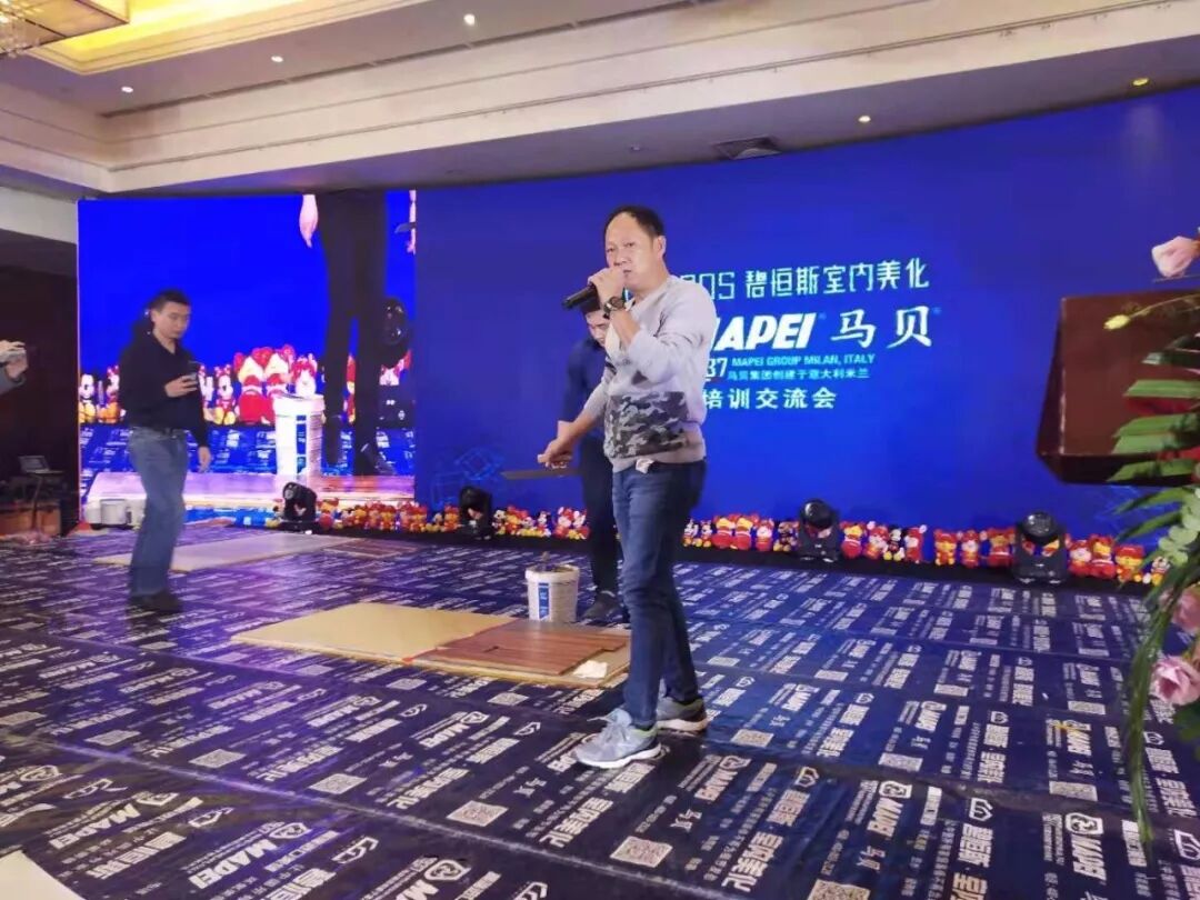 马贝产品系统讲座主要围绕防水及瓷砖粘贴等方向进行,马贝销售经理刘传兵先生细致地讲解当下流行的大板铺贴工艺和胶粘剂的选用等,并向来宾介绍了尤适用于家装和零售市场的独特性能产品。台上台下互动,气氛热烈。