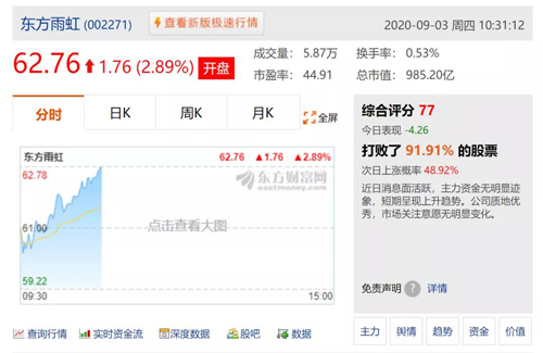 截至9月2日收盘,东方雨虹总市值已超过950亿,今日开盘,东方雨虹总市值迅速冲向980亿,截至发稿,东方雨虹总市值为985.2亿!