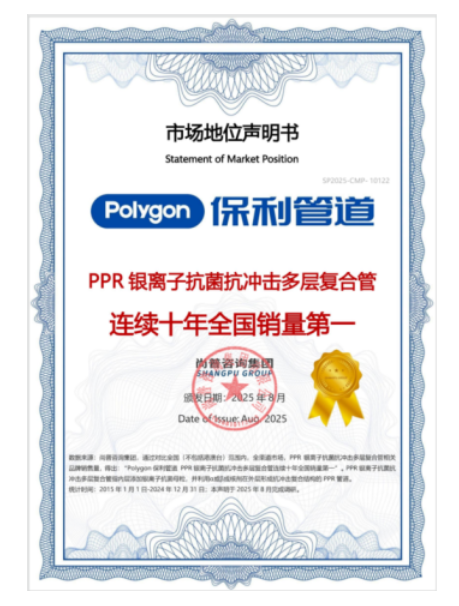 2025年8月,尚普咨询集团向Polygon保利管道颁发市场地位声明书。此次Polygon保利管道荣获尚普咨询【Polygon保利管道PPR银离子抗菌抗冲击多层复合管连续十年全国销量第一】市场地位声明,这一成绩不仅彰显了Polygon保利管道在行业内的卓越地位,也为中国管道市场的发展注入了强大动力。
