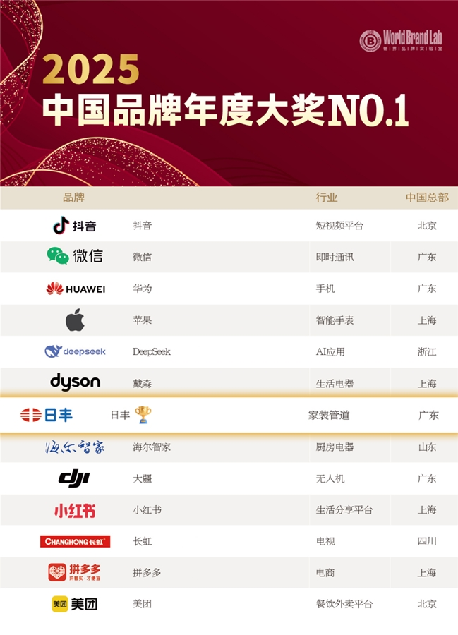 12月17日,由全球三大品牌价值评估机构之一的世界品牌实验室(World Brand Lab)主办的第22届“世界经理人峰会”现场传来重磅喜讯——日丰企业集团有限公司(以下简称“日丰”)斩获2025年“中国品牌年度大奖家装管道NO.1”殊荣,与华为、抖音、微信、苹果等35个全球顶尖品牌共同站上行业之巅。