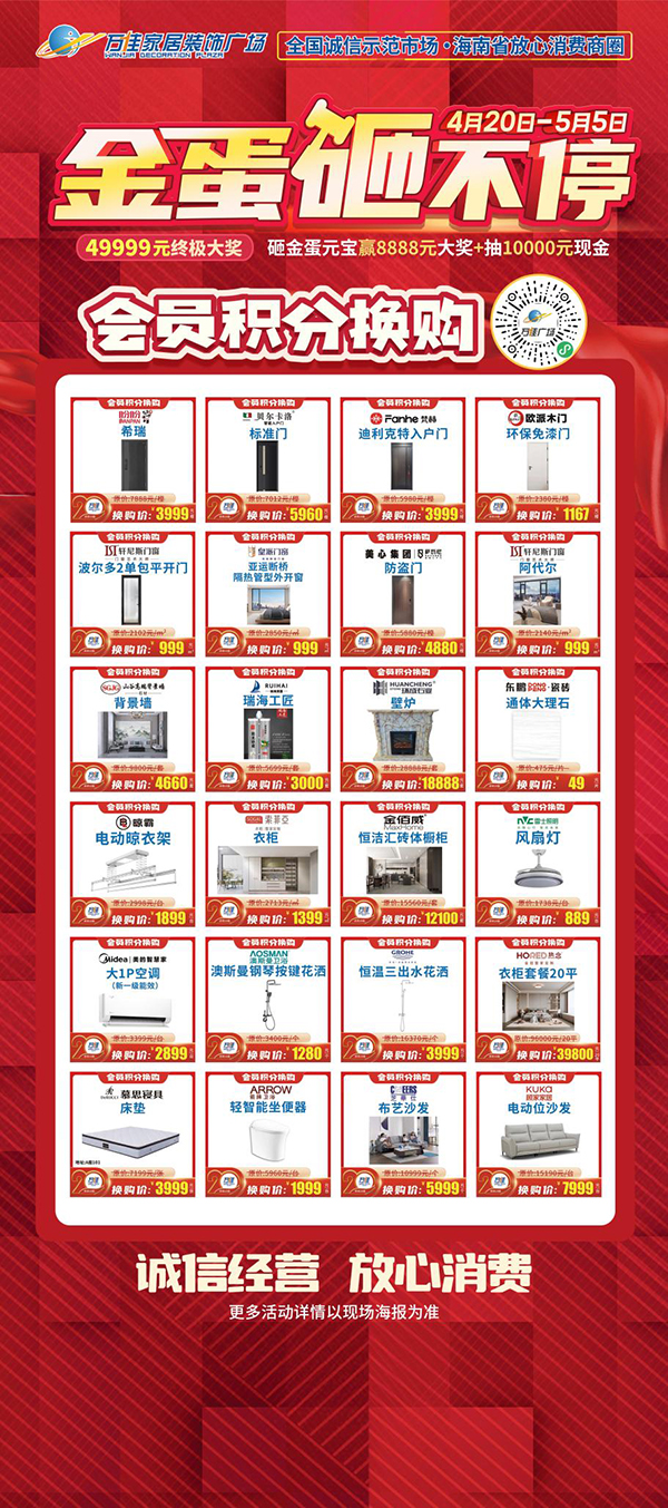 其中,最受瞩目的活动之一是“砸金蛋元宝,赢8888元大奖”。活动期间,顾客在万佳广场任意专卖店消费实付金额每满一定金额,即可砸金蛋或金元宝,赢取丰厚的奖金,最高奖金高达8888元。这一活动不仅让顾客在购物的同时有机会赢取大奖,也增加了购物的趣味性和互动性。