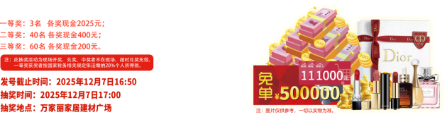 活动期间内(10月9日-12月7日)在万家丽家居建材广场&家居生活广场任意门店下单满5000元(金额可累积),即可在12月7日活动当天在建材、家居前台领取抽奖号码一个,跨品牌实付满5000元可领取两个抽奖号码,同一地址、同一客户最高五个抽奖号码封顶。同时,下单顾客还可参与2026年1月18日您购物我买单50万元免单抽奖活动!单笔付款满1000元即可获得抽奖券一张,满2000元获得两张,多交多得!开奖时间:2026年1月18日17:00