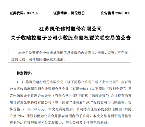同日,凯伦股份发布《关于收购控股子公司少数股东股权暨关联交易的公告》指出,公司拟以现金方式收购苏州和彩企业管理合伙企业(有限合伙)(下称“和彩企管”)及 苏州源彩企业管理合伙企业(有限合伙)(下称“源彩企管”)合计持有的苏州佳智彩光电科技有限公司(下称“佳智彩””)18%股权,交易价格 17,159.58 万元。