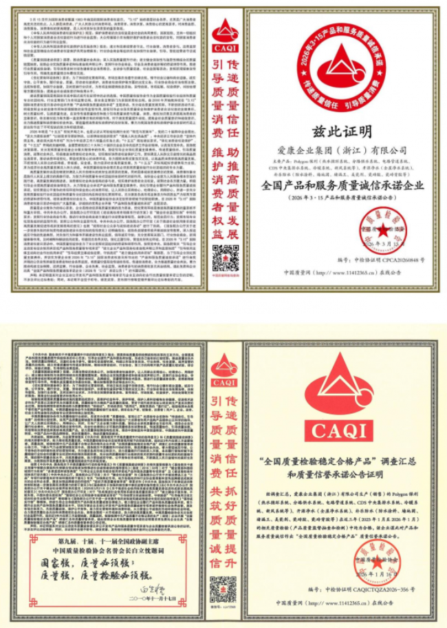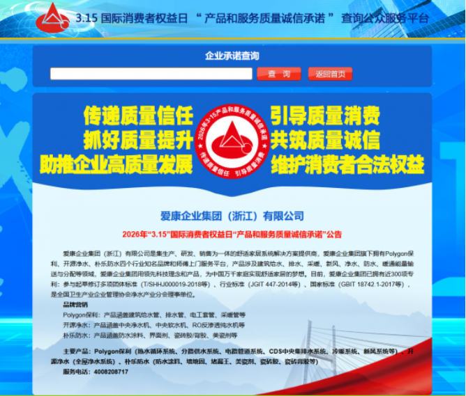 2026年3·15国际消费者权益日,中国质量检验协会主办的2026年“产品和服务质量诚信承诺”主题活动正式公布入选企业名单。作为国内隐蔽工程领域的头部企业,爱康企业集团(浙江)有限公司(以下简称爱康企业集团)凭借多年来在质量管控、诚信经营、消费者权益保障等领域的突出表现,成功入选本次活动示范企业,旗下Polygon保利管道、开源净水、朴乐防水三大品牌全品类产品同步纳入“全国质量检验稳定合格产品”公示名录。