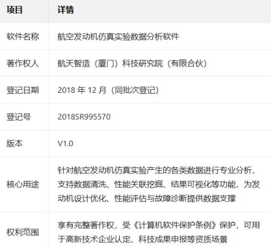 这项软件著作权不仅为航天智造(厦门)研究院构建了坚实的技术壁垒,更助力企业顺利通过高新技术企业认定、斩获多项重点项目立项。针对航空发动机仿真实验数据规模大、维度多、分析难的行业痛点,这款软件通过智能化数据清洗、算法化规律挖掘、可视化结果输出,大幅缩短研发数据处理周期,减少不必要的物理试验次数,显著降低试验耗材与时间成本,加速最优设计方案落地。从技术突破到产业赋能,这款软件正以专业的数据之力,为航空发动机自主研发筑牢数字化底座,助力中国制造业产业向高端化、智能化稳步迈进。