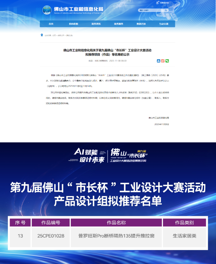 近日,第九届佛山 “市长杯” 工业设计大赛获奖名单重磅揭晓,皇派门窗「普罗旺斯Pro断桥隔热提升推拉窗」凭借突破性设计理念与硬核技术创新,从海量竞品中脱颖而出,成功斩获「产品设计创新奖」,为佛山门窗行业设计创新版图再添高光!