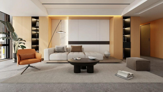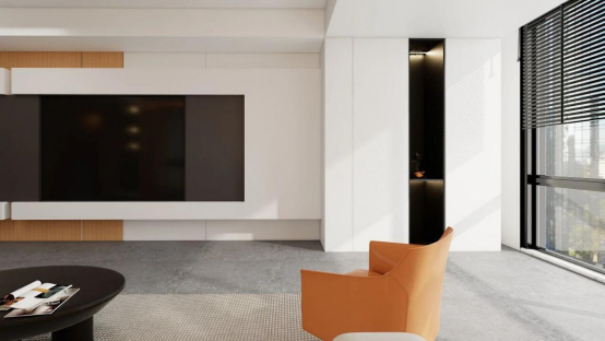 阳光穿过白纱漫进空间,白色柜体与米脂白墙面晕出柔和的光影边界;满墙收纳柜嵌入了带灯光的黑色开放格,和白、米色调形成层次,连沙发旁的落地灯线条,都像风掠过空间留下的轻痕。暖橙色单椅与浅灰抱枕,又给这份柔和添了点鲜活的温度。