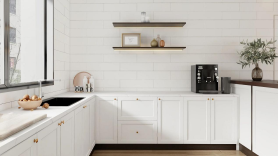 厨房用满墙也以星月白定制柜做基底,黄铜小拉手添了精致感,黑色厨电与纯白柜体形成柔和碰撞,清爽又温柔。