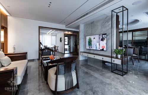 本案例将东方文化与现代简约相结合,酝酿出独特的新中式美学风格,传统中式的韵味与现代元素的时尚性相糅合,和谐、平稳地在空间流淌出新中式的意蕴,巴黎世家柔光瓷砖的温润柔和,增添几分艺术碰撞后的从容。