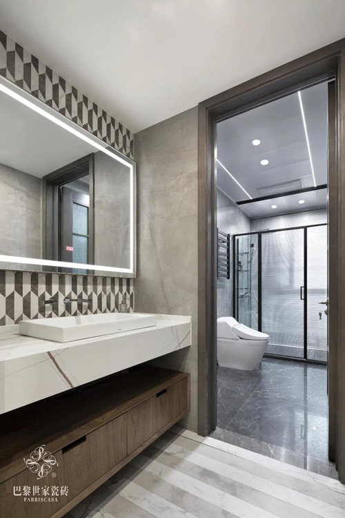 柔光瓷砖铺设的卫浴空间,北冰洋的柔雅美好,梵高灰的随性有力,互相融合,同时又冲击视觉,外敛内扬在此中淋漓尽显。