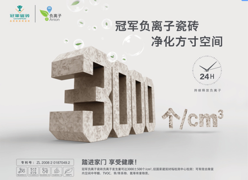 你听说过负离子净化器,但你听说过会释放负离子的瓷砖吗?冠军负离子瓷砖,24H持续不断释放负离子,经国家权威机构检测:冠军负离子瓷砖负离子释放量可达3000±500个/cm³。