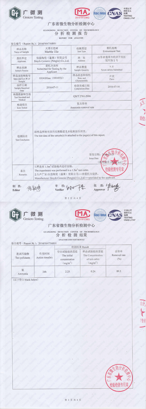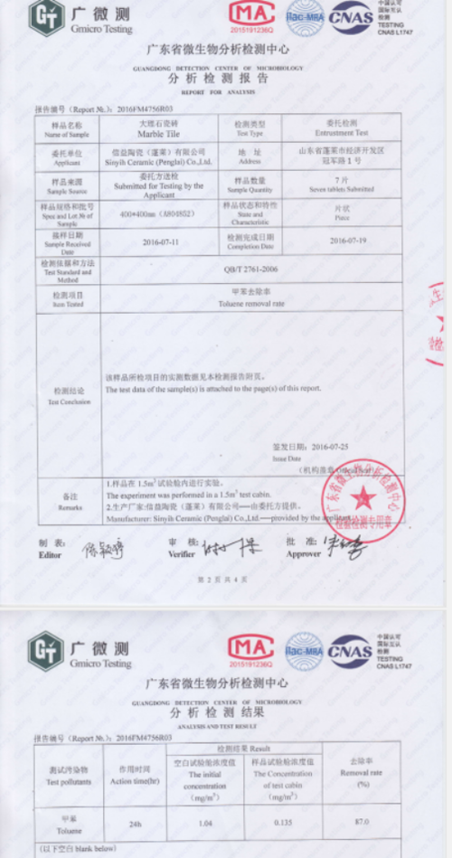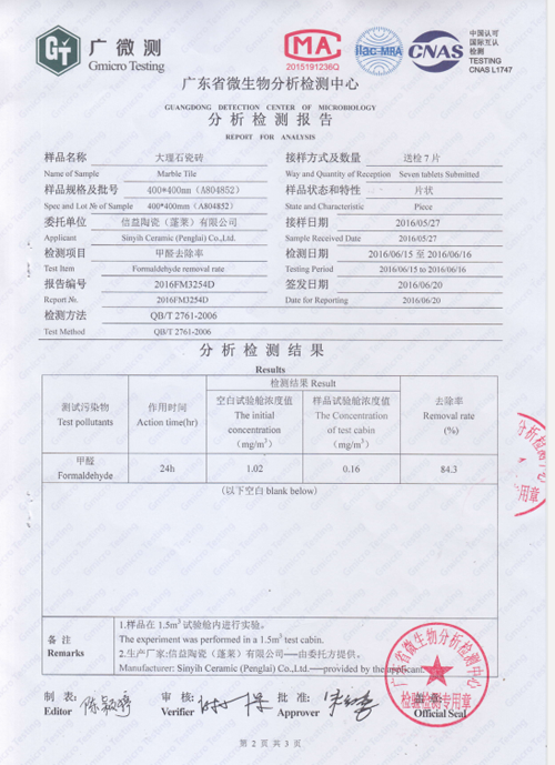 经国家权威机构检测:冠军负离子瓷砖负离子释放量可达3000±500个/cm³,经广东省微生物分析检测中心检测,冠军负离子瓷砖24H可去除室内空间中的甲醛、TVOC、氨、苯/苯系物等有害物质。冠军负离子瓷砖大理石系列甲醛去除率84.3%以上,TVOC去除率89.1%以上,氨去除率89.3%以上,苯/苯系物去除率87%以上)