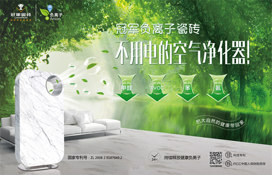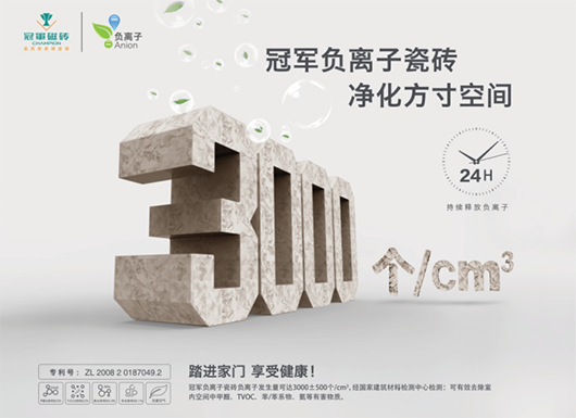冠军负离子瓷砖24h持续释放负离子量可达3000±500个/cm³,经广东省微生物分析检测中心检测,冠军负离子瓷砖24H可去除室内空间中的甲醛、TVOC、氨、苯、甲苯等有害物质。以大理石负离子瓷砖系列为例,甲醛去除率84.3%以上,TVOC去除率89.1%,氨去除率89.3%,苯去除率88.2%,甲苯去除率87%)。