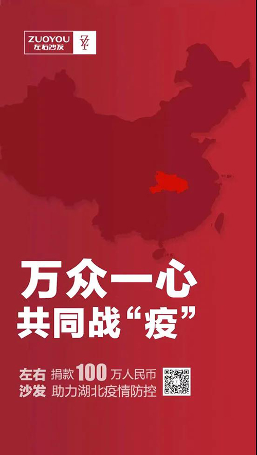 新冠疫情爆发以后,左右沙发第一时间凝聚企业之力,于1月29日向湖北黄冈红十字会捐赠100万,全力支持疫区,助力疫情防控。