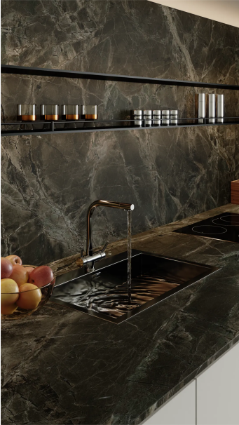 凝山川魂魄,铸自然诗篇,采风·观山系列以山为骨、以势为魂,将天地造物的磅礴力量凝练于岩板之上。采用造物仿生5.0工艺与DHG多重数码模具叠加技术,实现35微米间隙精细度与1500微米凹凸幅度的立体肌理复刻,既保留了原始岩石的粗犷张力,又赋予现代建材的精致触感,1:1还了原岩石的岁月肌理,以造物仿生工艺为笔,在方寸间勾勒出千重山色。