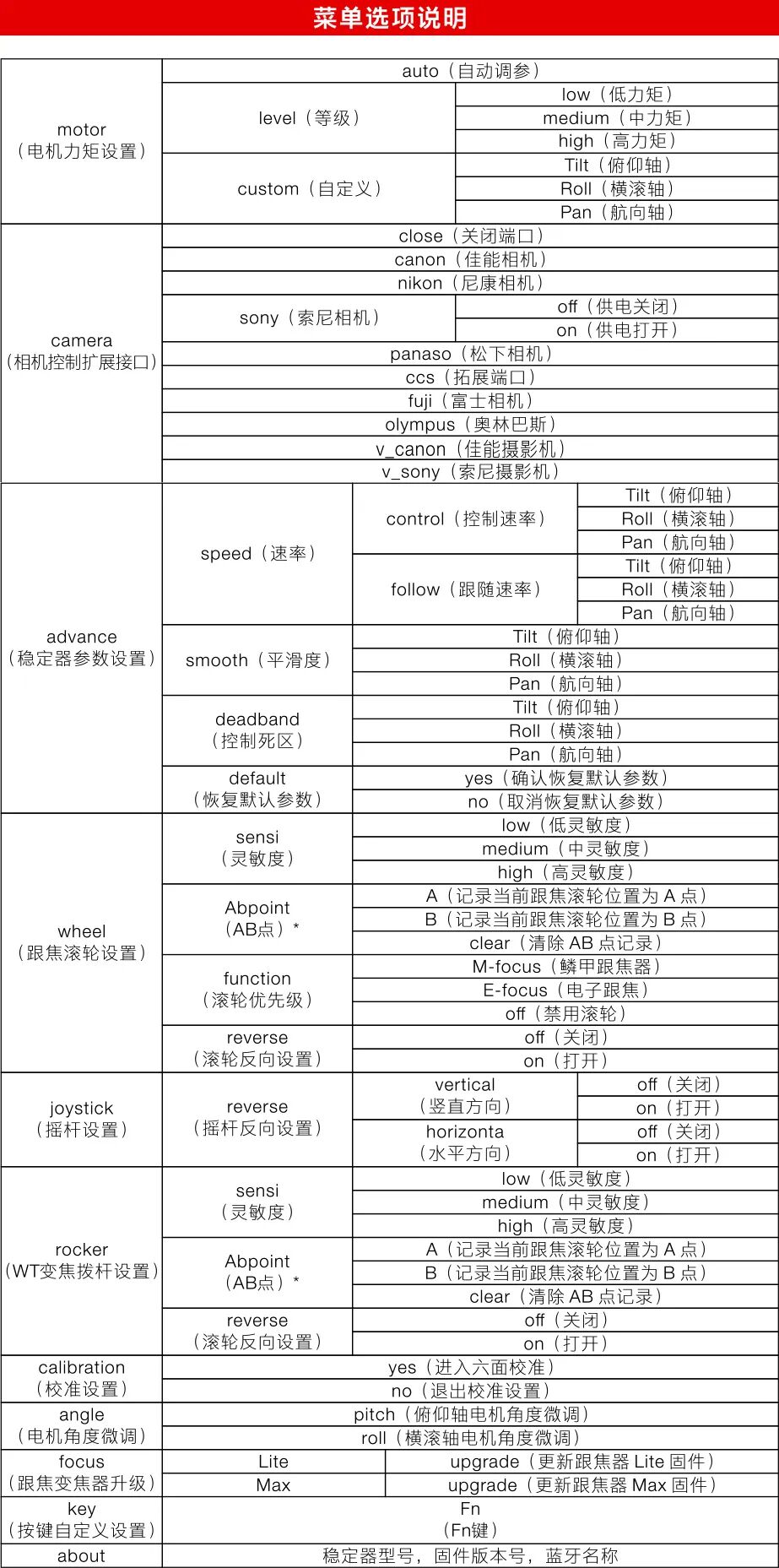★ 单击鳞甲3S提壶控制手柄上的拨轮下键,进入稳定器菜单选项,可调节或查看:Motor(电机力矩设置)、Camera(相机控制扩展接口)、Advance(稳定器参数设置)、Wheel(跟焦滚轮设置)、Joystick(摇杆设置)、Rocker(WT变焦摇杆设置)、Calibration(校准设置)、Angle(电机角度微调)、Focus(跟焦变焦器升级)、Key(按键自定义设置)、About(关于),各选项及设置说明如下。