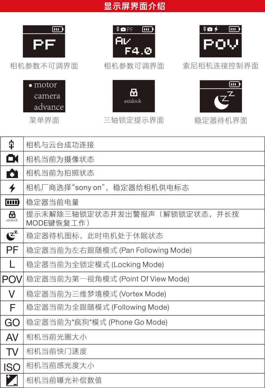 >> L / 全锁定模式 单击MODE键,此时稳定器三个电机全部锁定,相机朝向不会跟随手柄运动而运动。向上推或向下推摇杆改变相机俯仰角度,向左推或向右推改变相机水平朝向。
