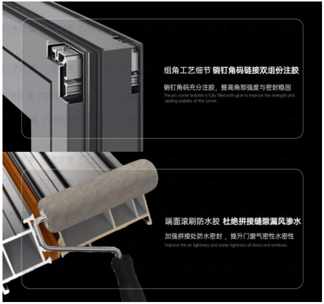 素派门窗采用销钉角码注胶连接,角码与型材缝隙间,注入德国WEISS韦思(原卫仕)双组份组角胶,型材端面滚刷防水胶,大幅提升提升角部结构强度,全方位严丝合缝,拼接密合不渗水,提高门窗防水性能。