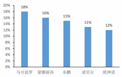 根据优采云数据,在建筑陶瓷类应用品牌方面,马可波罗以18%的占比居首位;蒙娜丽莎次之,占比为 17%;东鹏第三,占比为 14%,前五位建筑陶瓷应用品牌占比达到74%。