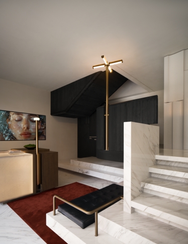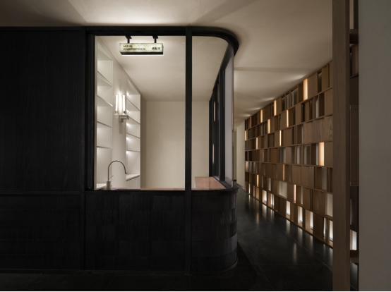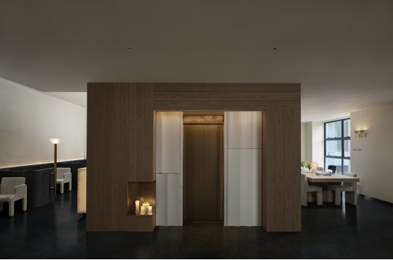 踏入室内,光线主导材质对话。透光玉石与原木岛台交织光影,奠定纯粹质感;白金沙石台阶与黑色木材在光线映衬下冷暖相映。无主灯设计以间接照明与氛围光源构建光系:陶砖电梯间内,壁龛烛火散发暖调微光;前台借背景与透光桌面,让光线在墙面静静流动。木阶与墙面的明暗对比自然划分等候、交流区,光线成为空间的隐形引导。