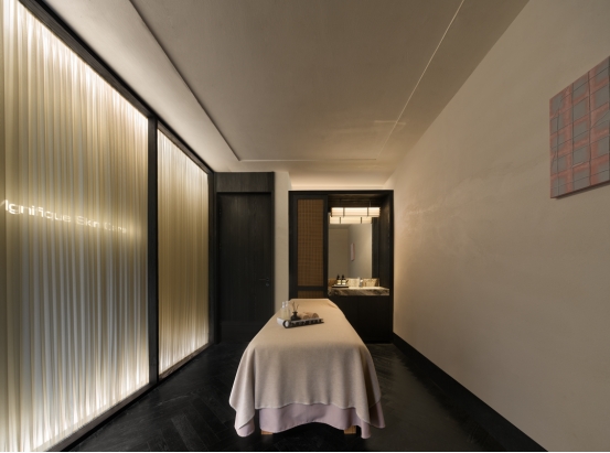The third-floor tea lounge, with its soaring ceiling, serves as a poetic highlight. Abundant natural light streams through the sloped roof, and the open, airy views allow guests to relax and socialize in a natural, laid-back atmosphere. In the treatment area extending inward, light flows naturally along the pathways.