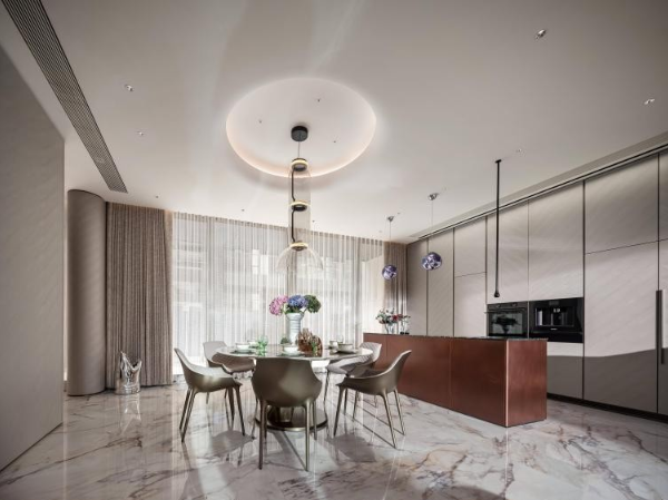 开放式餐厨布局拓展了多元生活场景。天然大理石中岛与金属材质碰撞,低调中见奢华;VERSACE与ROSENTHAL联名餐具点缀其间,演绎古典与摩登并存的视觉盛宴。