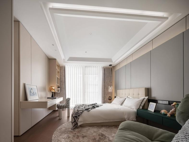 主卧选用GIORGETTI家具以及柔和地毯/床品,柔和的暖色搭配木纹肌理相得益彰,构筑如云端包裹般的睡眠空间体验。主卫依托全景玻璃设计,将沐浴变为与自然对话的仪式。岩板一体铺贴、定制大理石台盆及质感五金,共同定义奢适卫浴体验。衣帽间以木饰面与线性灯光构建摩登秩序,书房则通过金属与木材对话,打造理性而宁静的精神领地。