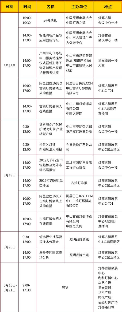 除此之外,“2019灯饰行业市场趋势及海外市场拓展报告”、“创新知识产权保护 助力灯饰产业转型升级”、“抖音×灯饰 新潮玩法大揭秘”、“2019灯饰照明品类沙龙”、“灯饰行业社群营销技术分享会”等一众等高端会论坛将围绕灯饰照明产业展开交流及思想碰撞。