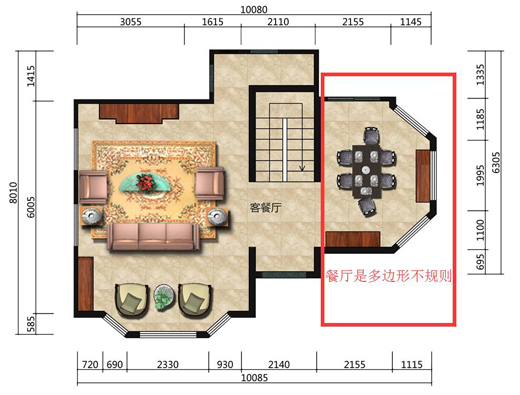 “但是到家具入场的时候就愁了,因为是不规则的多边形,好多成品的家具尺寸不对,都不能放;放下去不仅空出角落一大片空间,还占用餐厅其他空间,难看不说,还不实用。”
