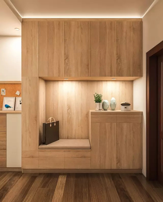 ▲ 配合鞋柜使用,也可以适当减少储物格,改为坐凳和临时挂衣区,实用性没话说!