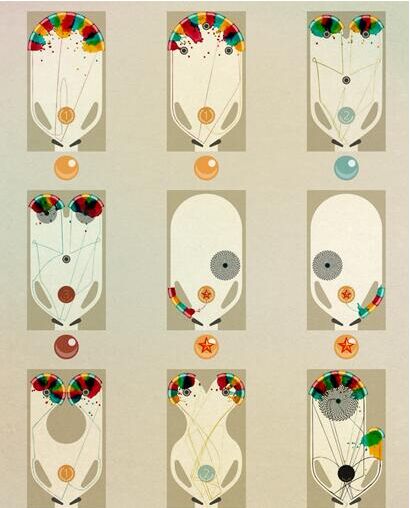 当你使用的球数越多,你留在弹珠台——或者说画纸上的线条就越杂乱,并且黑乎乎的,如果你只用一个球,并且三两次弹射就完成关卡,那么画纸上的线条就是清晰明亮的。