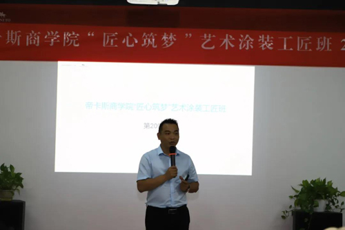 帝卡斯创始人、总经理江庆朝先生致欢迎词,对学员的到来表示热烈的欢迎,对工匠班的顺利开班表示祝贺。开班仪式上江总全面分析了行业当下及未来发展趋势,分享了涂装与设计的色彩搭配应用等专业理论知识和提升工程质量与操作细节的技巧、以及讲解了本期主题的重要意义:何为匠心、如何筑梦。