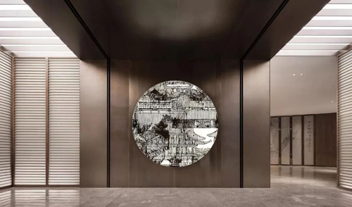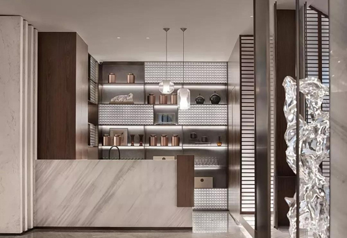 接待厅顶部用软膜天花做主要照明,立面格栅内部暗藏小功率洗墙灯。中间金属顶考虑整体的美观性,只在墙面艺术装置画做内透的效果。