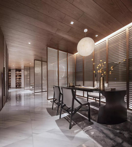 二层顶部照明灯具采用方形窄边框射灯,与方形木质顶相结合。琴台、靠墙的画幅等重点照明区域由射灯照亮。木质格栅底部照明既是空间的分割又是整体的排列有序的装置。